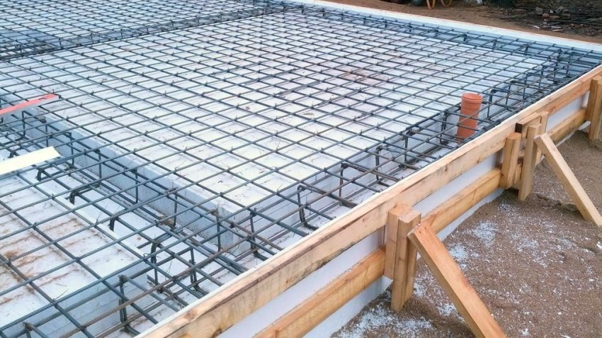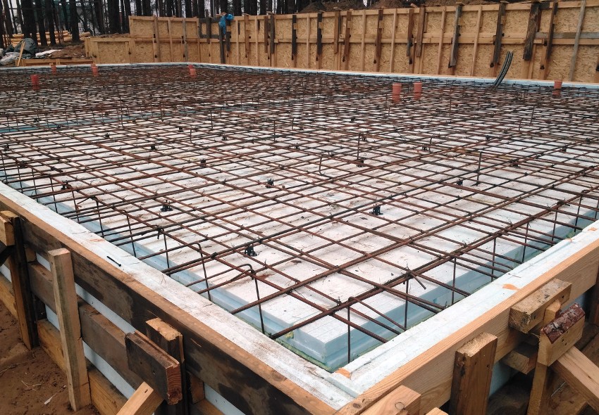 The thickness of the rods is selected taking into account the structural, snow and operational loads on the surface. Utilities should not be installed in the stiffeners. In order not to damage the insulation, it is recommended to assemble the spatial reinforcement cage separately, and then you need to lay it ready-made on special clamps in the area where the grillage is located, where the frames are interconnected. The binding of the slab mesh is done on site. The lower structure is mounted on PVC clips.