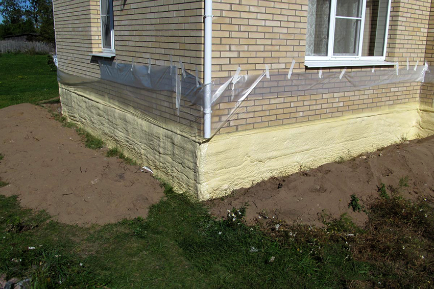 Do-it-yourself insulation of the foundation of an already built house has recently become popular to perform using foamed polyurethane foam, characterized by excellent consumer qualities. The only drawback is the need to use a special installation when applying, in which the polyol and isocyanate are mixed under pressure, after which the polymer synthesis begins. During the reaction, carbon dioxide is formed, which creates bubbles that are isolated from each other. Spraying is carried out in a thin layer on a previously cleaned and prepared base.