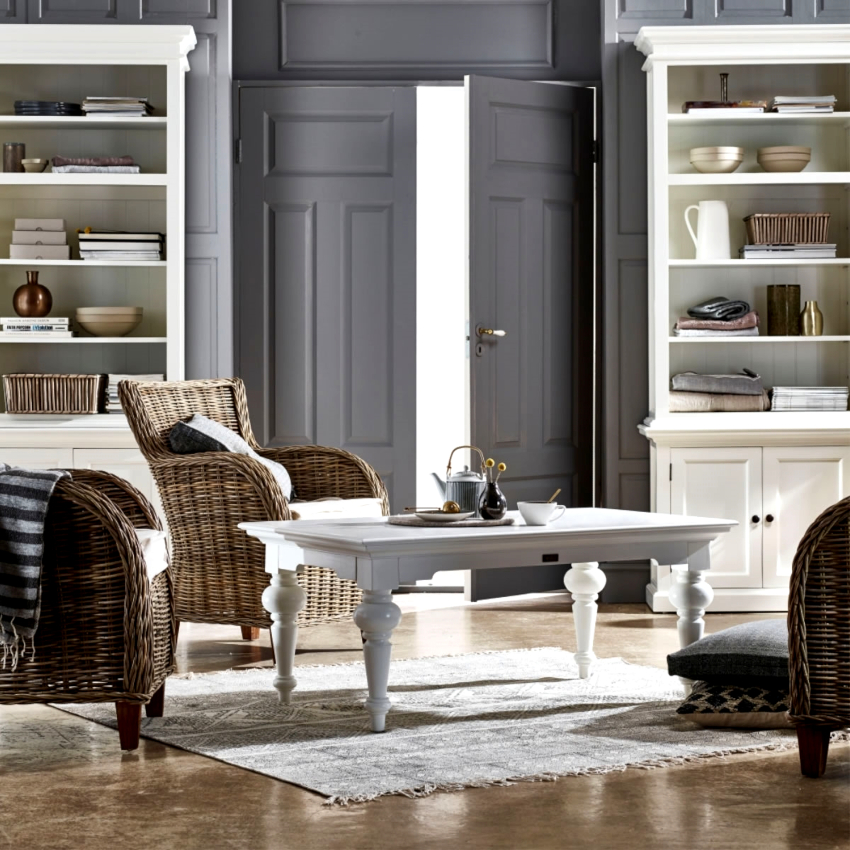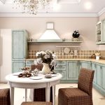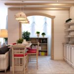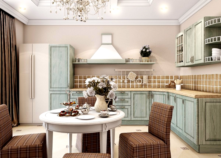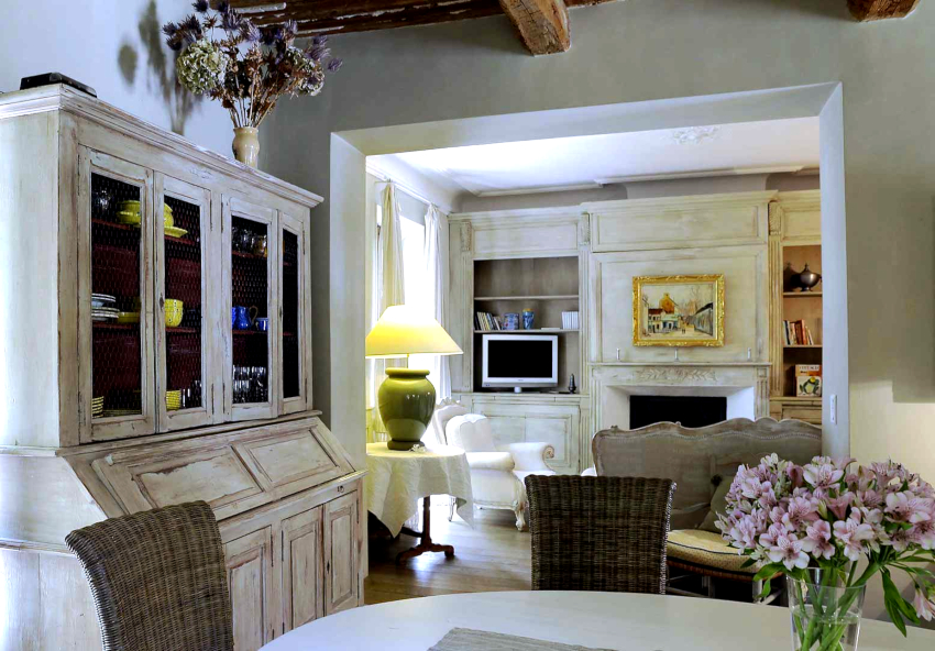 The leading role in rustic provence is given to white and its shades. Against such a light background, wooden furniture with a patina effect looks expressive and distinct. The “burnt-out” shades of blue, violet, yellow, green and purple will help to bring into the room a feeling of coziness and warmth. Contrasting chocolate inserts look original with white trim.