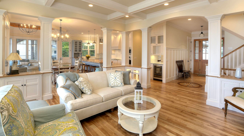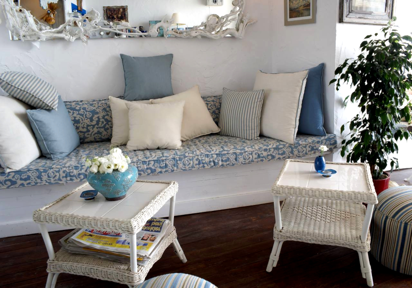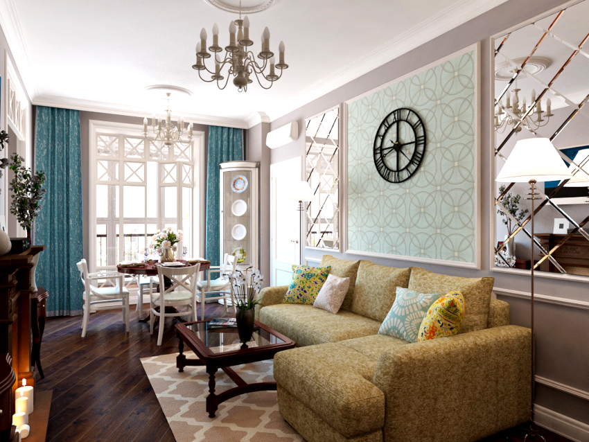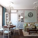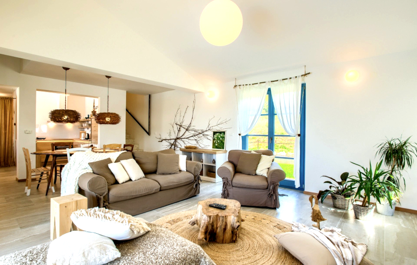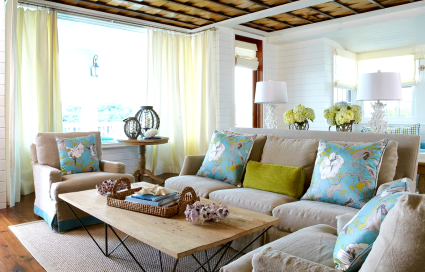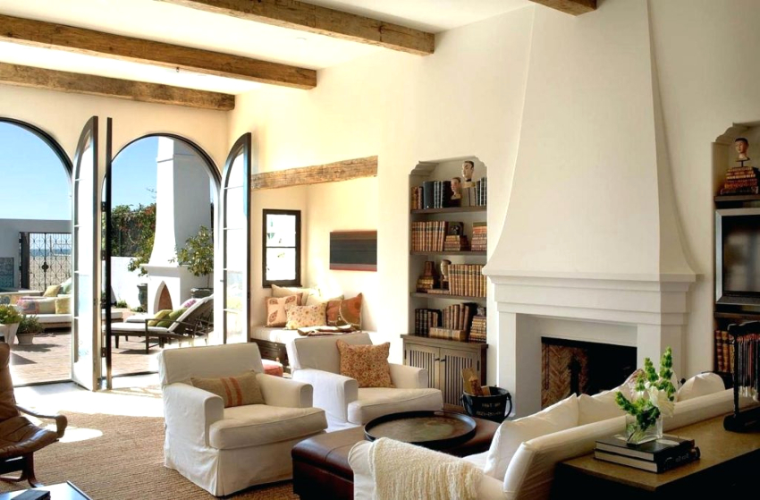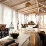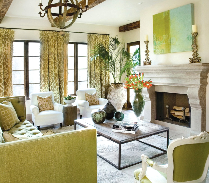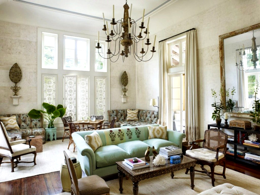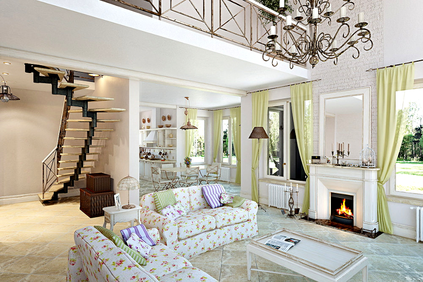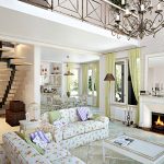 The room is decorated in light colors with the use of natural natural shades, which should be restrained and muted. White, milky, lavender, olive, turquoise and light blue are used predominantly. Preference is given to terracotta, mustard, yellow warm shades, which seem to have burned out in the sun, which is clearly shown in the photo of the living room design in a private house.