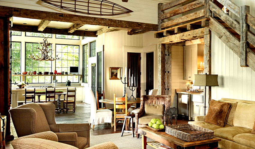 Features of the rustic design of the living room in the house