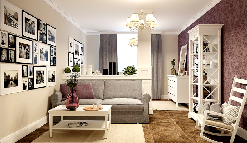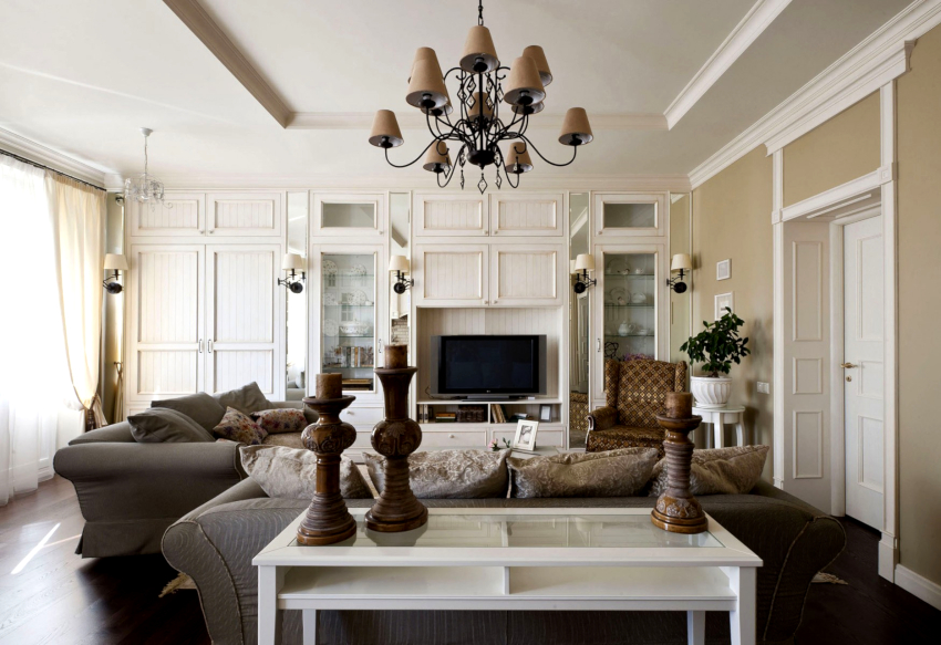 In a classic-style room design, flashy shades will look out of place. The room is decorated in a light, calm color palette, complemented by wooden elements. Bronze and gold inserts will harmoniously fit into the interior. The white living room, complemented by brown and beige blotches, looks noble and elegant. The sophisticated design of the living room in the apartment (the photo is a clear confirmation of this) can be obtained by using a calm purple hue as the main background, which dissolves into gilded elements.