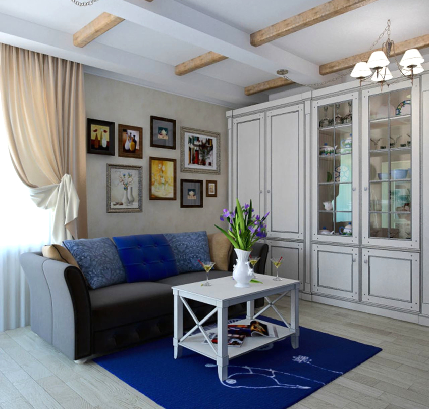 Elements of furniture for a living room in Provence style should have an elegant and graceful appearance, devoid of decorativeness. The hallmark of the rustic style is the rough, worn surface (with an aging effect), which gives it a special gloss. All furniture should be made of natural wood and decorated with carvings and monograms. The use of forged elements is allowed. Different furnishings can be seen on real photos of the interiors of the living rooms in the apartment.