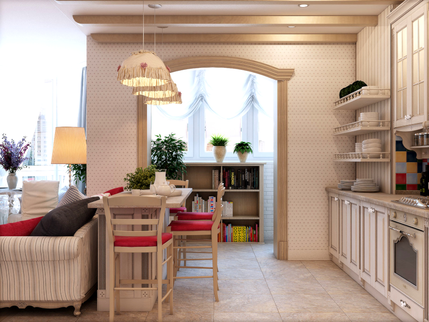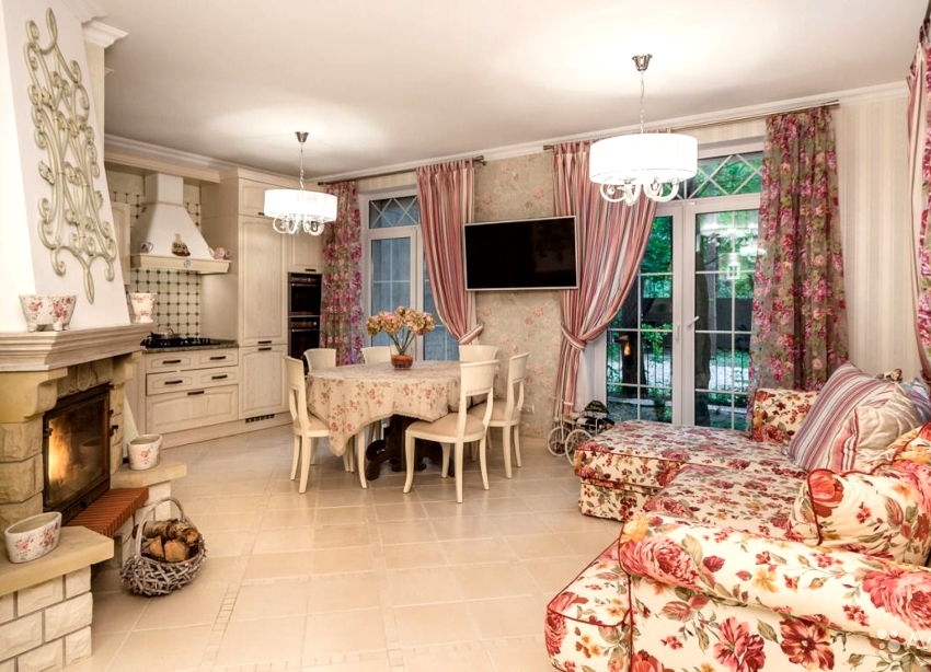 The Provence-style hall is characterized by the use of a large amount of natural textiles in the form of lace tablecloths, linen furniture covers, organza or chiffon curtains with canopies, and cushions with floral designs.