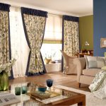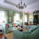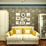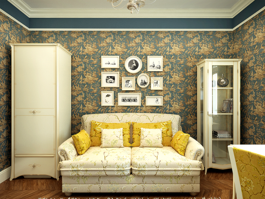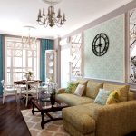 The combination of products with the same texture, but different print looks original. However, both options should have a common feature, which can be reflected in vintage matte, velor plating or metallic sheen. Such combinations are shown in the photo of the design of the living room studios.