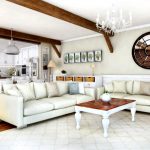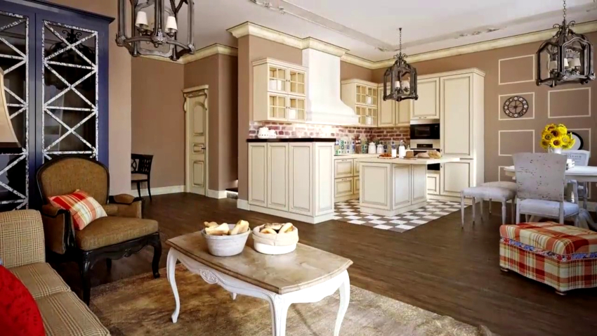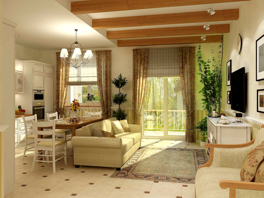 The design of the Provence style living room project involves the use of porcelain stoneware, natural stone tiles, ceramic products that imitate natural stone for flooring. Plank floors, which can be presented in the form of untreated wood or varnished, look organically in the rustic interior of the living room.