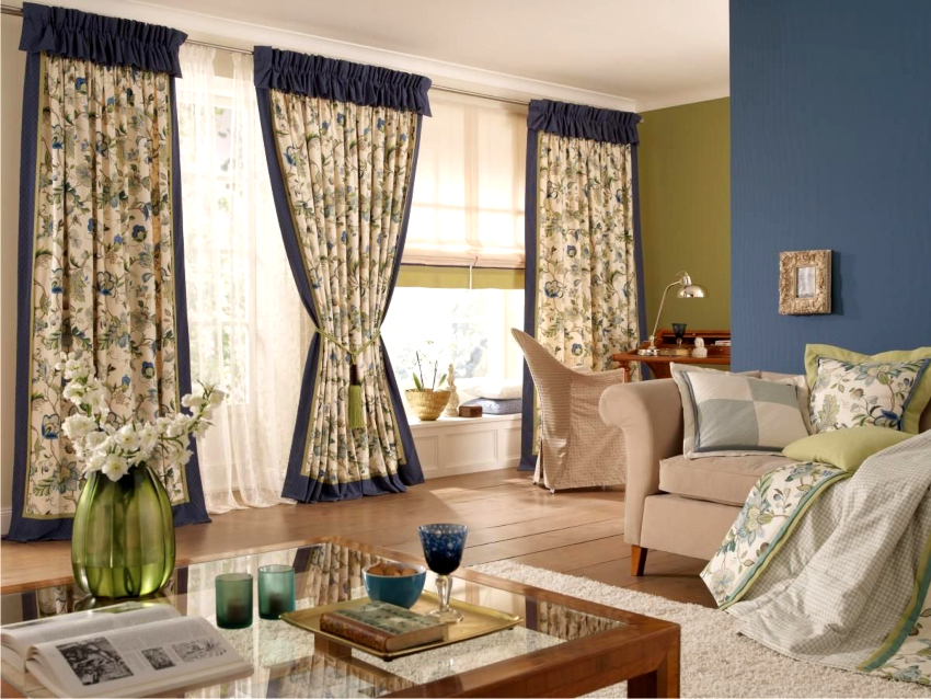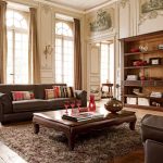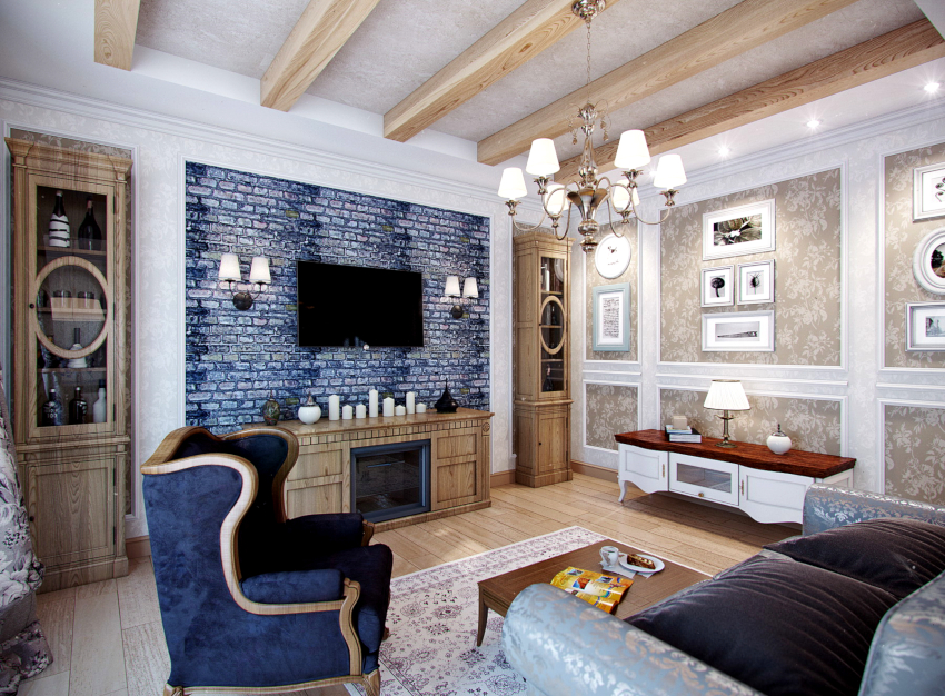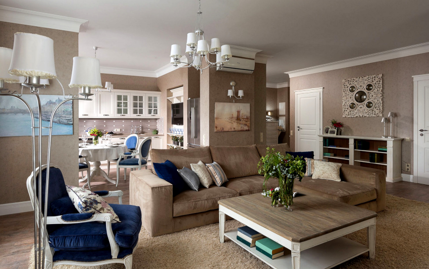 A conservative living room will come out with the dominant use of brown, which evokes associations with safety, reliability and stability. The classics can be embodied with a blue hue, which should be used in a metered amount as a background color for walls and ceilings. Dark wood furniture and bright textiles will help to make the cold atmosphere cozy.