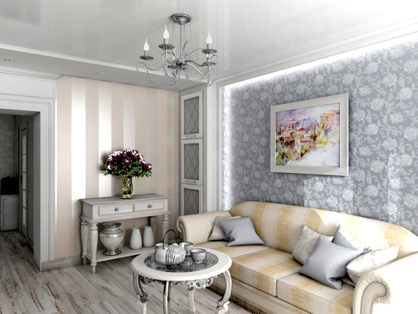 For living rooms with a low ceiling, the most suitable solution would be a vertical combination with alternating strips of wallpaper of different motives, but made in the same color palette.