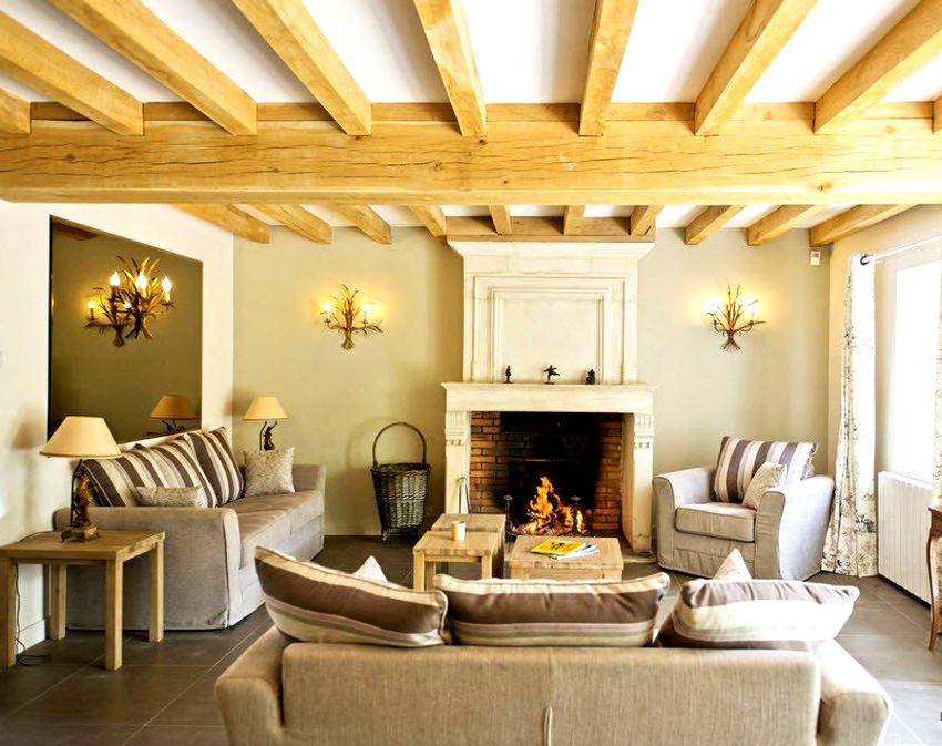 The ceiling should be perfectly flat, painted white. Wooden beams in a natural color give the color characteristic of the direction.