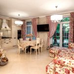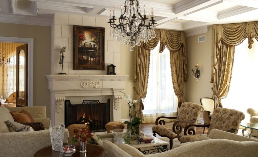 The finishing touch to the luxurious design is natural textiles. The windows are covered with heavy curtains with lambrequins. Upholstered furniture is covered with fringed bedspreads and tassels, and decorated with decorative pillows with an embroidered pattern.
