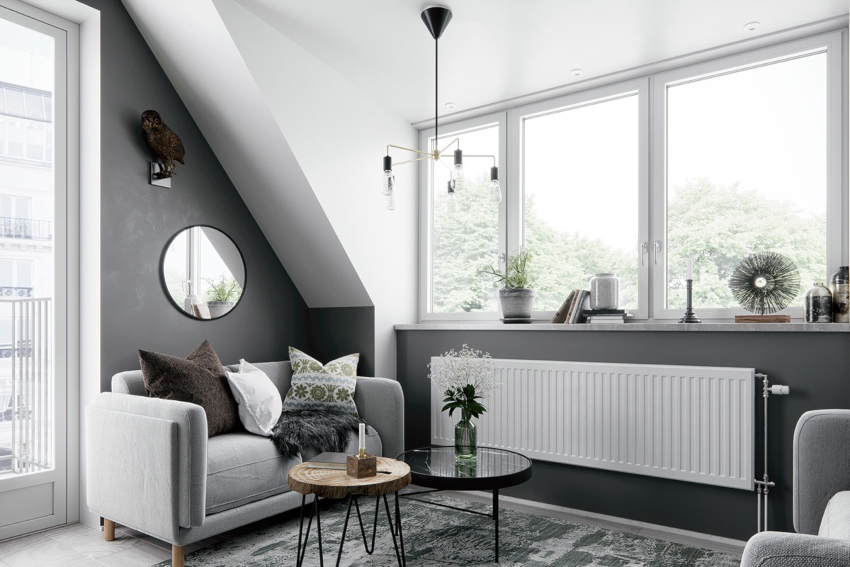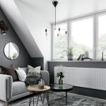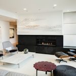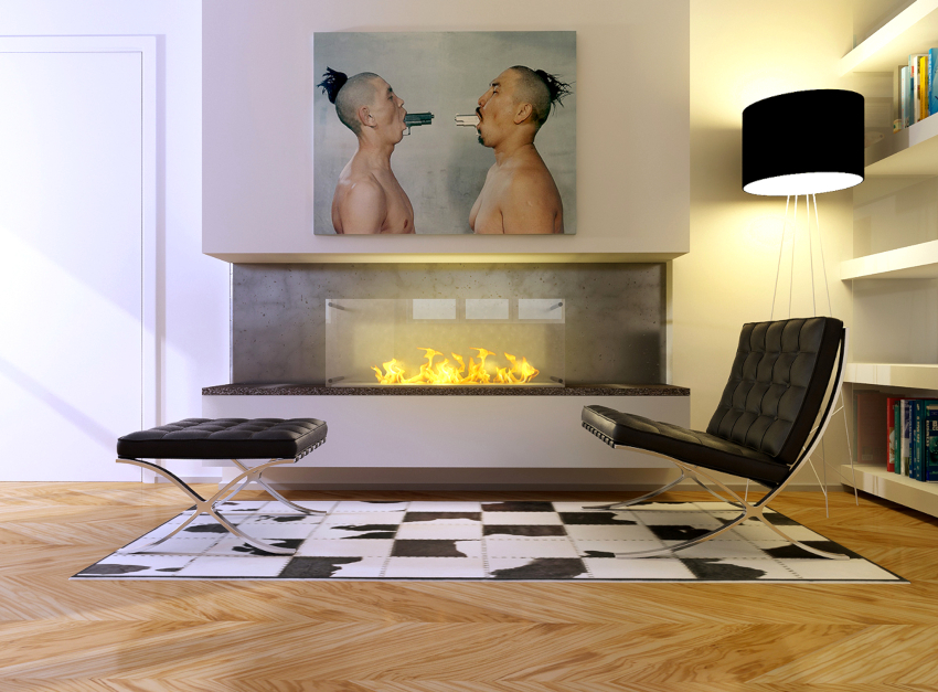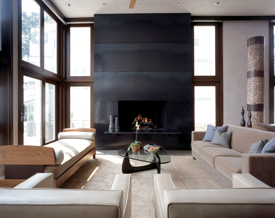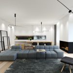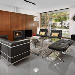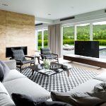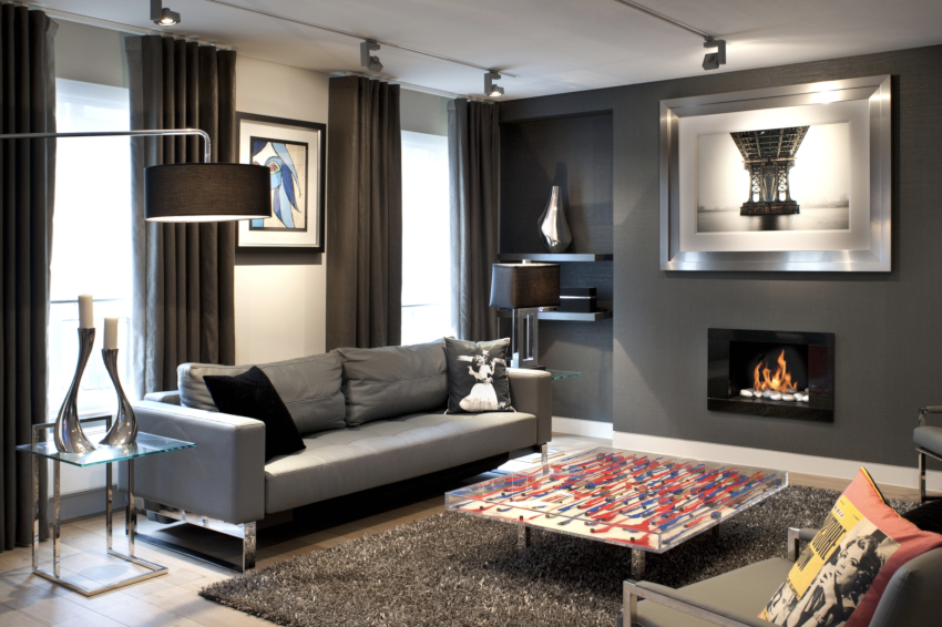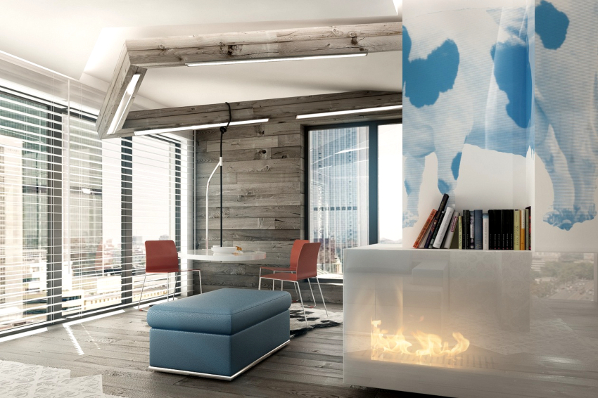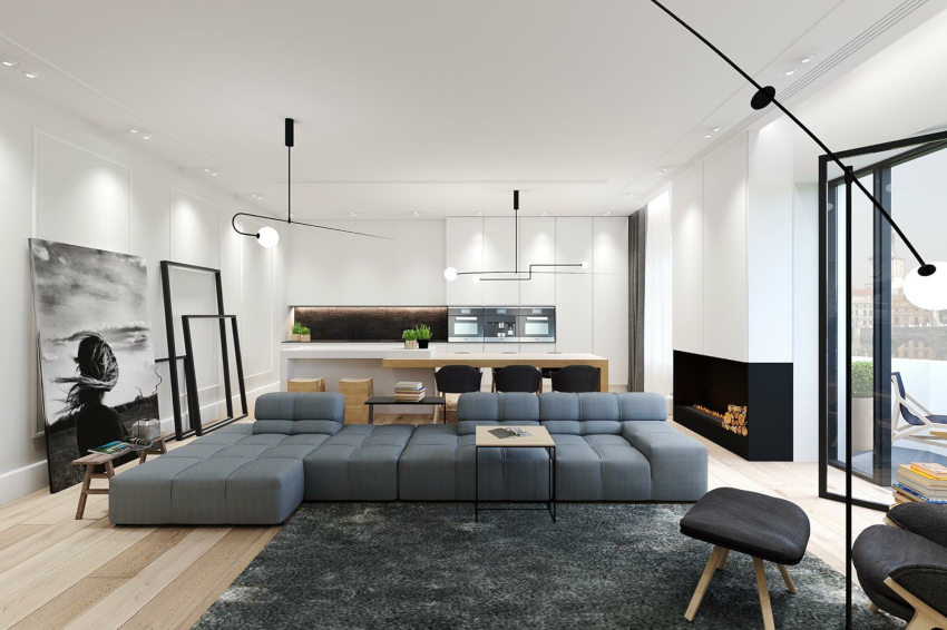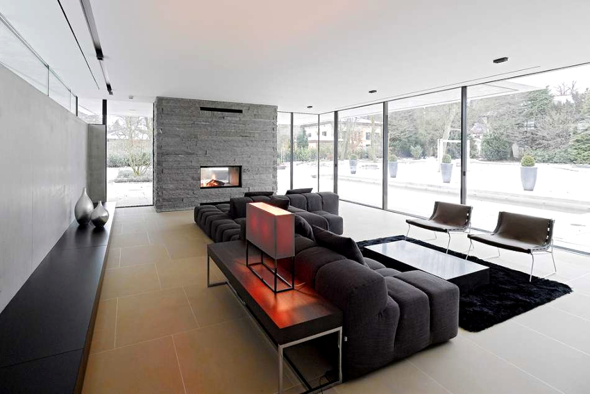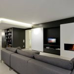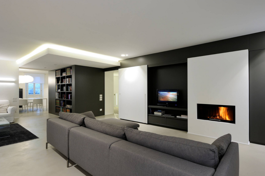 A bit of warmth can be added to the cold, technically restrained interior with the help of decorative elements in the form of sculptural figures, geometric vases, and abstract paintings. The electric fireplace of the original design will ideally fit into the overall concept of the living room.