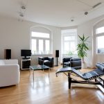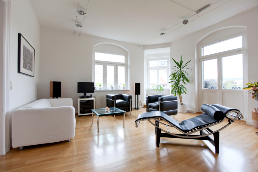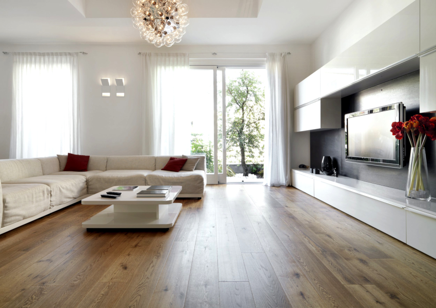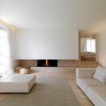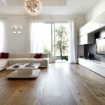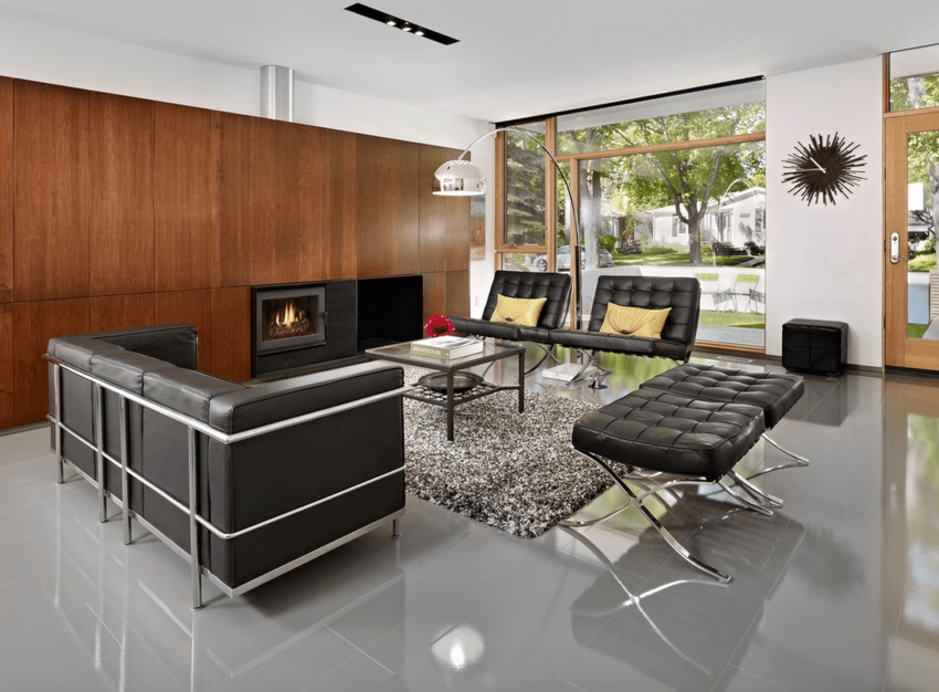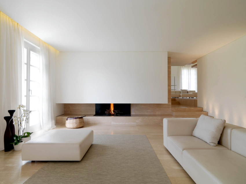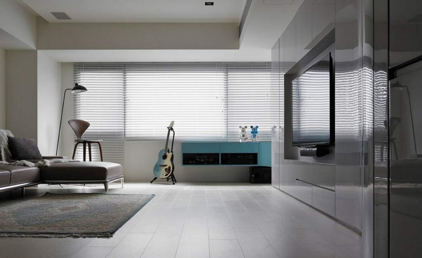 It is customary to finish the floor in the living room in the style of minimalism with natural stone, large ceramic tiles in light colors. The self-leveling floor will look original. Laying linoleum with a light geometric pattern is allowed.Natural wood and laminate flooring fit into the restrained interior in the best way. Preference is given to light bleached options.