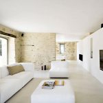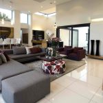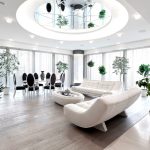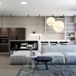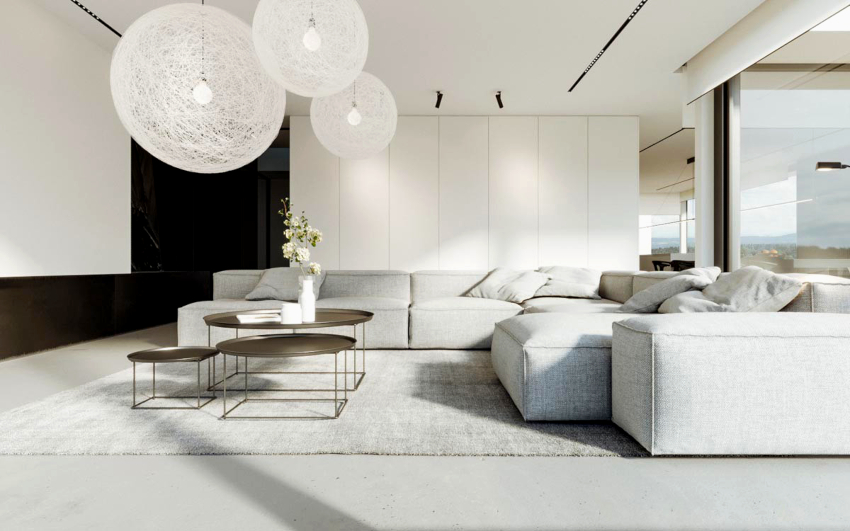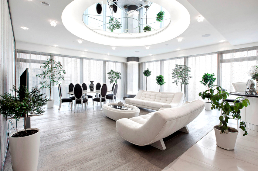 The upholstery should be solid. The rounded coffee table can be made of glass or stone. To organize a storage system, it is enough to use several closed shelves hidden behind a glossy monochromatic facade.