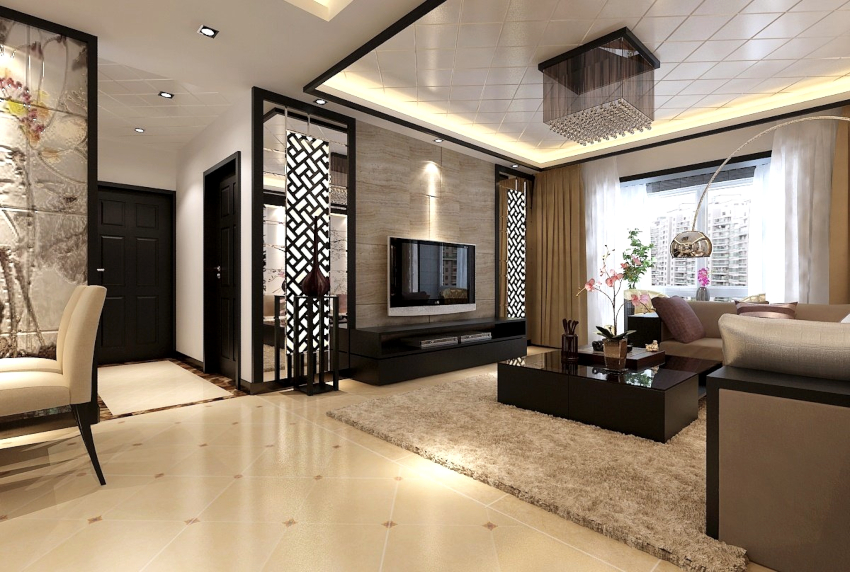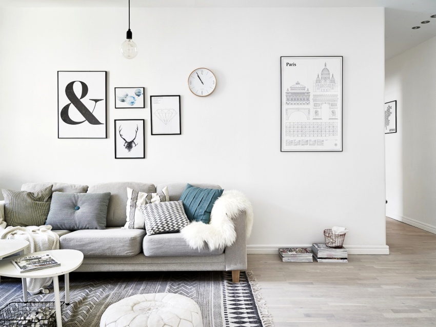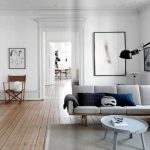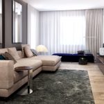 For finishing the floor, a herringbone parquet or laminate is selected in the same color palette as the furniture. Beautiful marble or ceramic tiles with a glossy surface will perfectly fit into the interior. To perform zoning of space, you can use the podium. For a warm and cozy atmosphere, place a rug with a high, dense pile near the sofa.