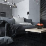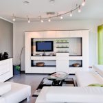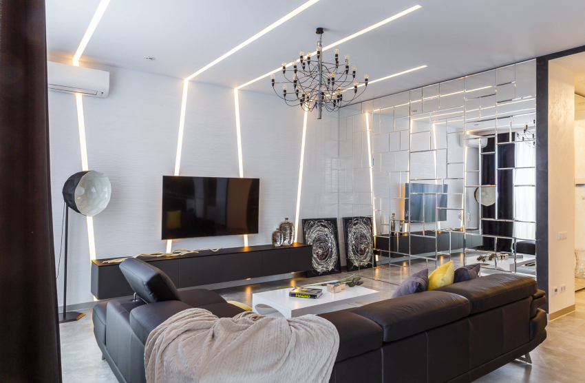 A minimalist living room should bathe in an abundance of natural light. Therefore, the windows are not covered with curtains. The use of Roman blinds is allowed. Spotlights, hidden lights and geometric discs are mounted for additional light. A good solution is neon lighting, which creates a sense of celebration in the room. Different lighting options can be seen in the photo of the living room design in the apartment.