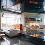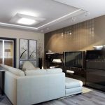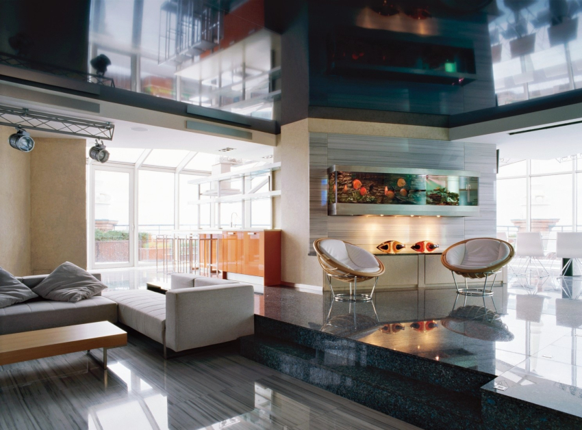 To decorate the ceiling, a glossy canvas with many lamps is used, which are installed at the final stage of the renovation. Photos of the living room design emphasize that the creation of a suspended structure made of plasterboard of an unusual configuration would also be a suitable option. Traditional surface painting is acceptable.