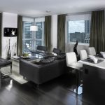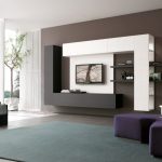 When choosing furniture for the living room, preference is given to modular systems, which are distinguished by functionality, practicality and ease of use. Bulky options will be inappropriate here. Cabinet furniture should have glossy fronts and chrome fittings. Glass elements in the form of a coffee table, rack or shelves will organically fit into the interior, which will give the atmosphere a feeling of lightness and airiness.