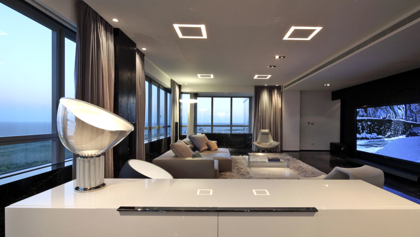 The interior design of the living room in high-tech style is made using white, black and gray colors