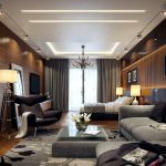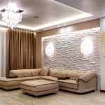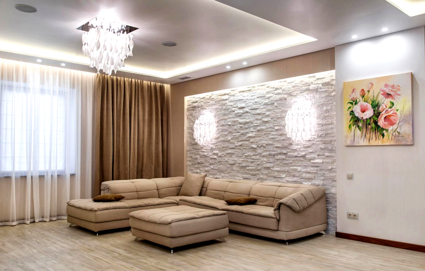 For wall decoration, mainly wallpaper is used, and designers recommend combining products that are different in texture, color and pattern. The original design of a large living room can be obtained using fabric cladding, which will fill the room with warmth and comfort. Traditional painting of walls, which should have a relief surface, looks simple, but tasteful. One of the walls can be decorated with artificial stone.