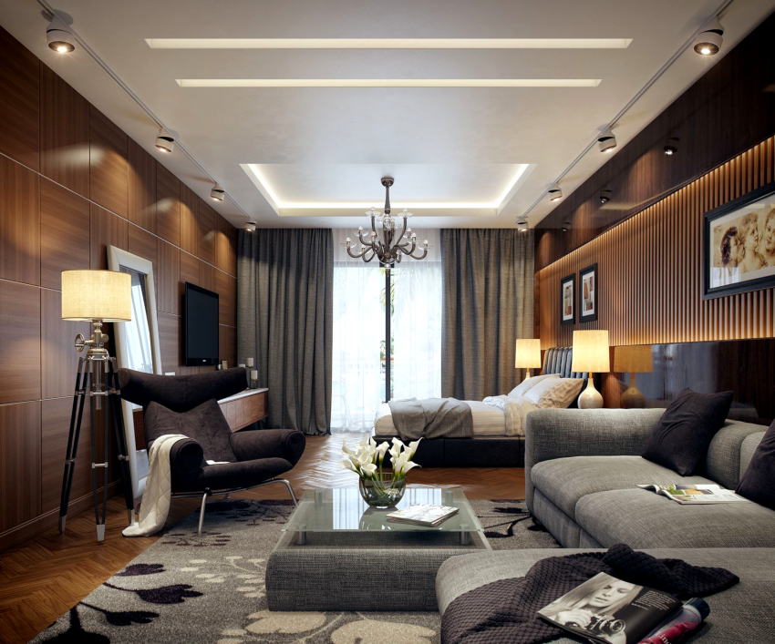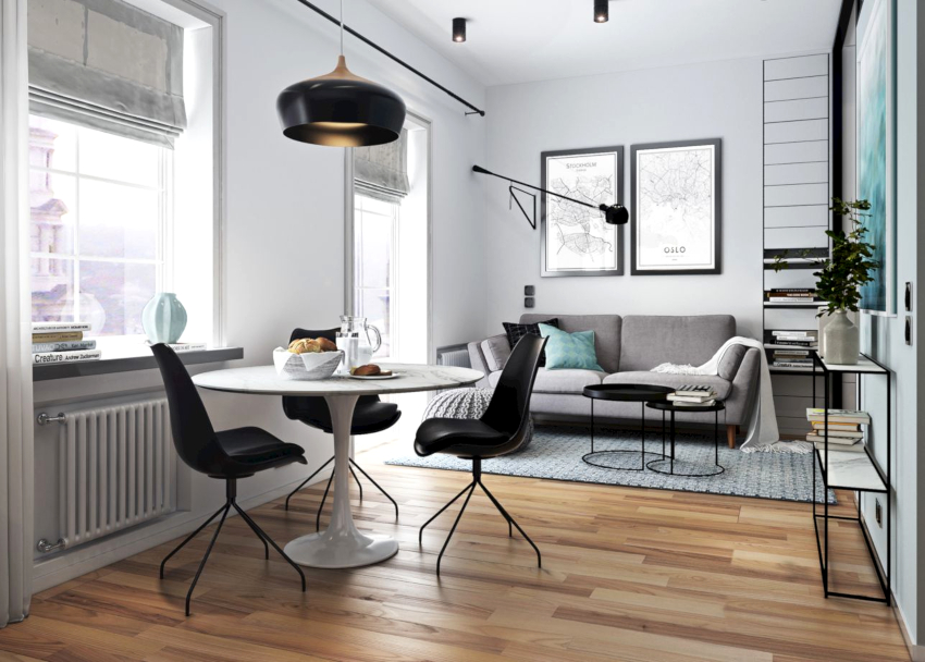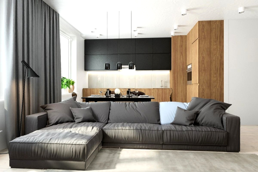 Upholstered furniture with a plain leather or synthetic fabric upholstery is selected. Transforming options in the form of modular sofa, wardrobe-bed, coffee table, which is converted into a dining table.