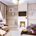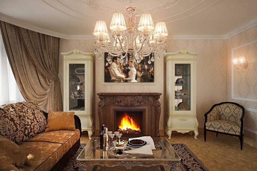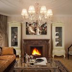 In a classic living room, a luxurious sofa with carved armrests, complemented by a pair of armchairs, an elaborate coffee table with curved legs, and a bookcase with gilded inserts will look appropriate. An essential element of a classic living room is a stone-framed fireplace. It needs to be supplemented with silver candlesticks on an open shelf above it. Different design options can be seen in the photo of the interior design options for the living room with a fireplace.