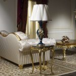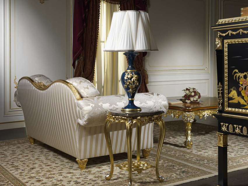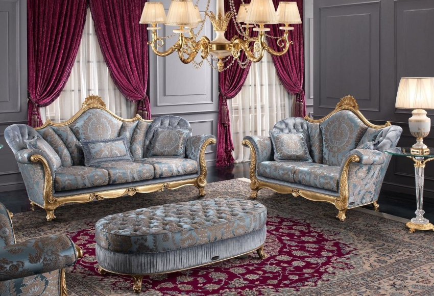 Silk, cotton and satin should be used as upholstery for upholstered furniture. The material is selected in restrained soft colors with small floral patterns, printed ornaments and gold embroidery.