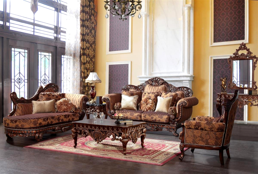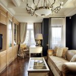 When designing a classic living room, special attention is paid to the choice of furniture. Massive, solid, expensive specimens made of natural material are used here. Natural wood takes the leading place. Furniture made of dark brown or mahogany wood will look especially noble and sublime, which is reflected in the photo of the interior design of the living room. Products are decorated with decorative elements in the form of bronze inserts or carved ornaments.
