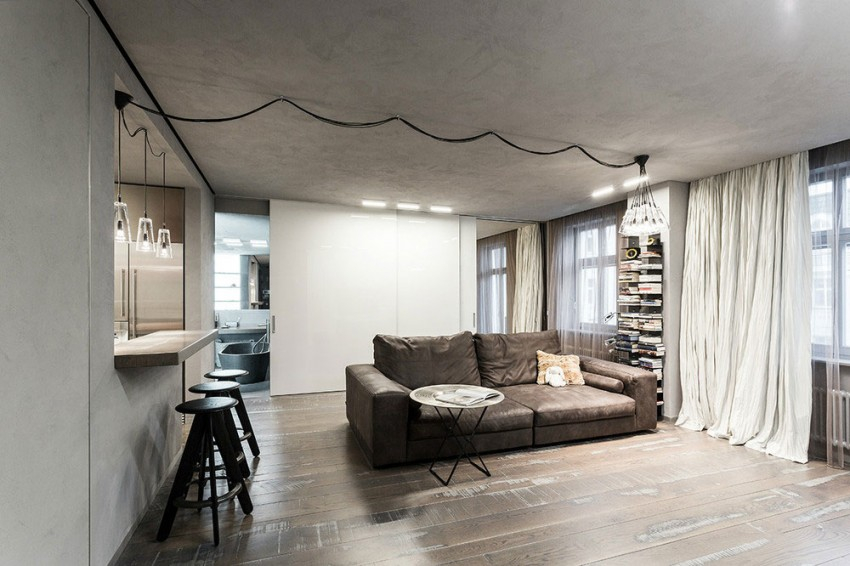 The walls of the hall in the style of minimalism are usually finished with decorative plaster. Brick walls or a painted concrete base will fit into the overall concept. Such deliberate negligence in decoration will give the room a unique charm, which can be seen in real photos of the living room design in Khrushchev.