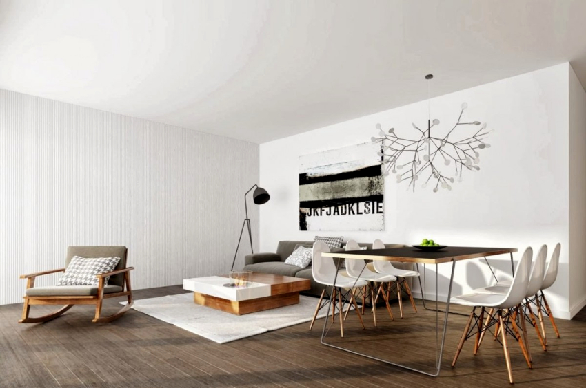 Wall, ceiling and floor decoration in the design of the living room in the style of minimalism