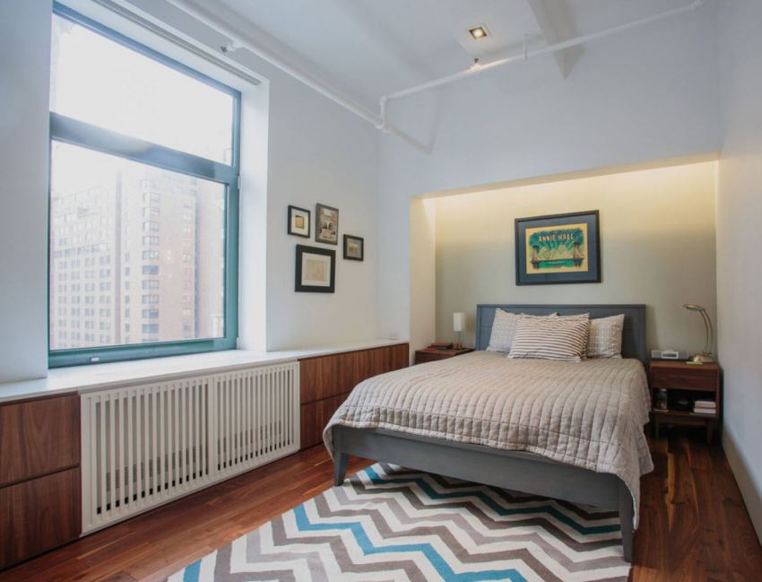 Another important element of any bed is a drawer, which will allow you to use the area occupied by a sleeping place more efficiently and free up more space in the room. It is desirable that the box is not close to the floor, which will greatly facilitate the cleaning process. In the interior of a rectangular bedroom with a window, it is recommended to install a bed with a headboard to the opening.