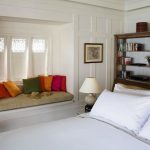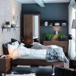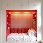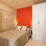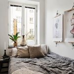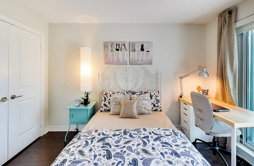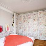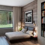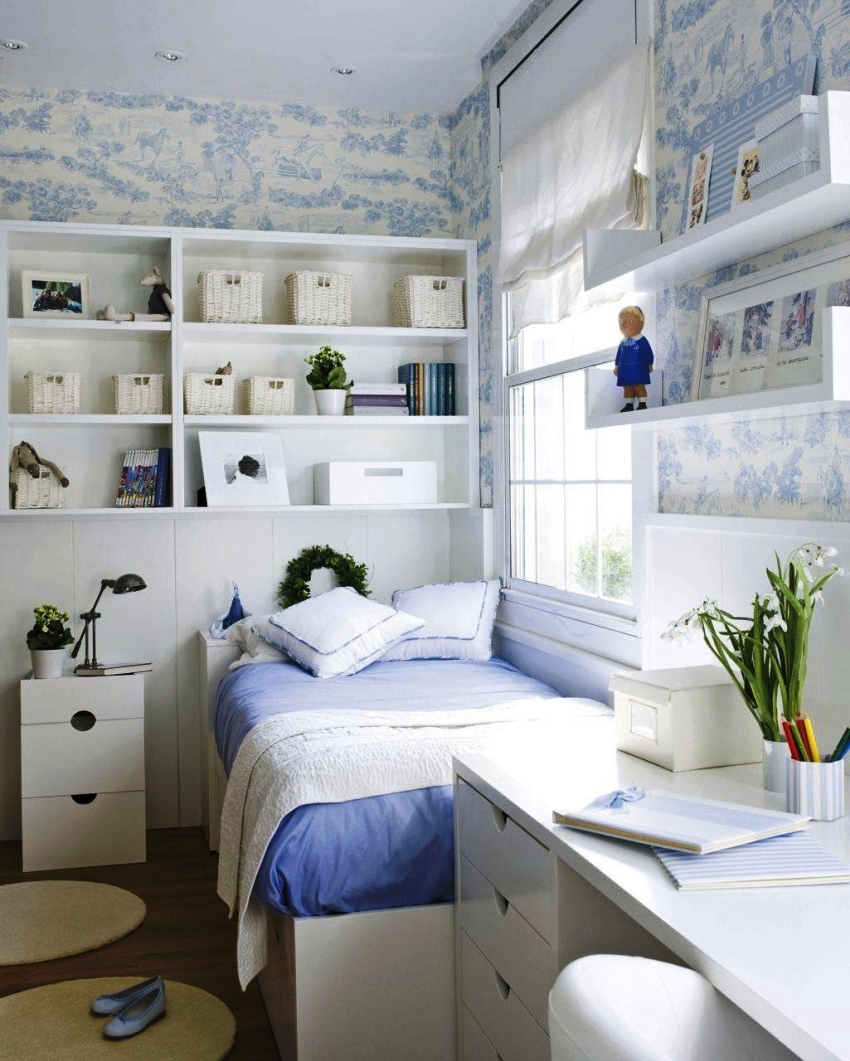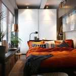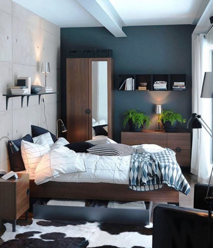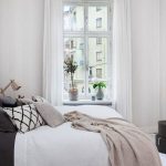 Another way to organize the space of a small bedroom is to install a bed against a free wall near the window. In this case, the bed is not placed in the center of the wall, but moves as much as possible to the window so that there is enough space to accommodate a small bedside table. A narrow but long wardrobe with sliding doors is installed against the wall opposite the window, the interior fittings of which are distinguished by a large number of shelves and drawers. The disadvantages of this option are the rather large dimensions of the cabinet and a small amount of free space.
