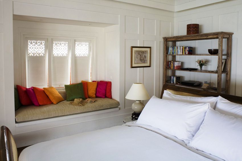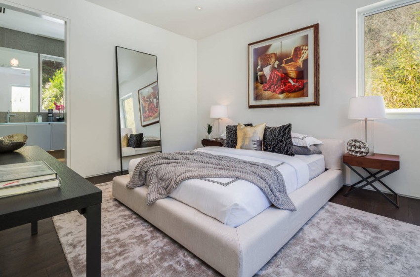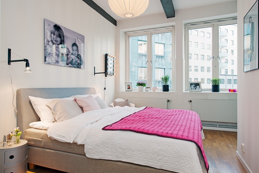 The absence of a bedside table in the room will free up space for installing a storage system, dressing table or reading chair