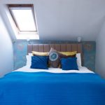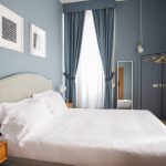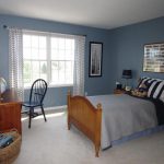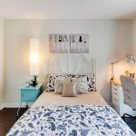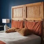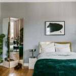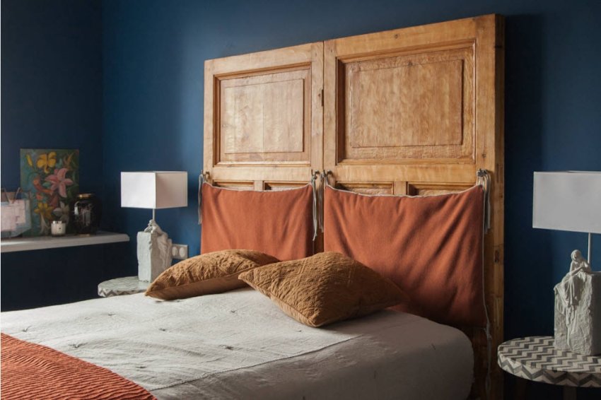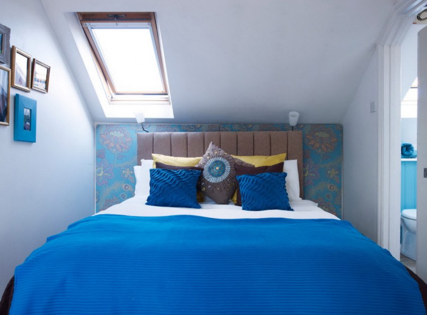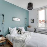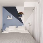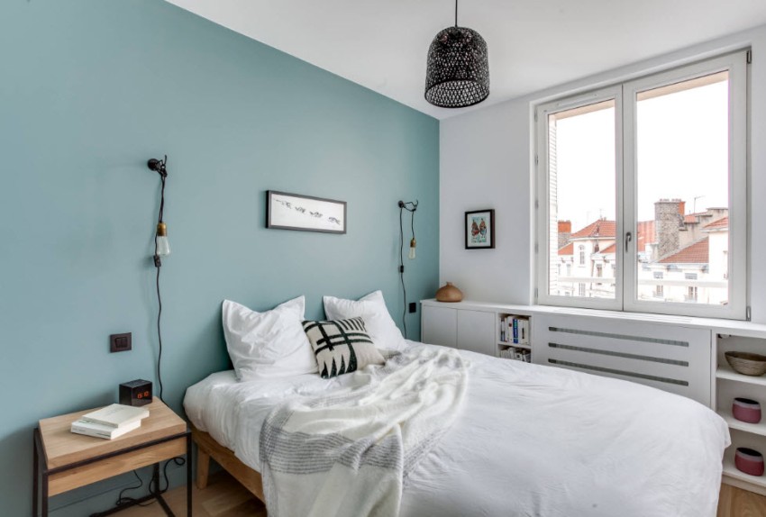 The accent wall at the head of the bed with color is a good design trick for highlighting the central piece of furniture in a small bedroom