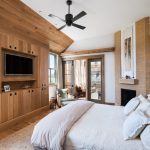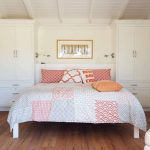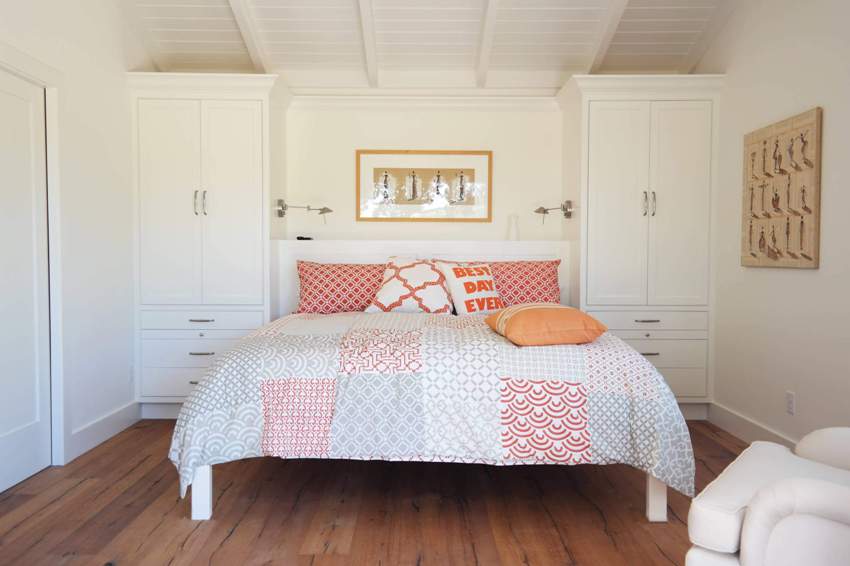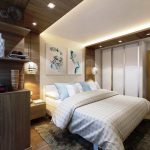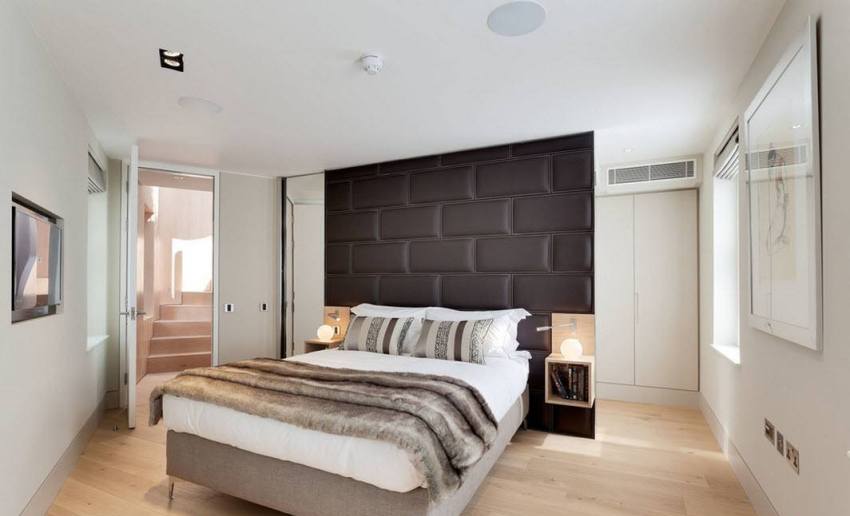 In the photo of modern bedroom designs, you can see another convenient way of arranging the space, when storage places are located behind the head of the bed and on the sides of it. In this case, a lot of free space is freed up, but the inability to install bedside tables is considered a significant disadvantage. Another drawback is the location of all pieces of furniture along one wall, which makes the interior feel congested.