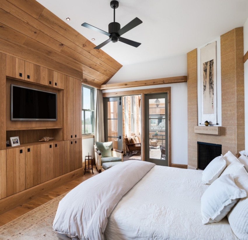 The bed can also be installed along the central wall, perpendicular to which the walls with a window and a door are located. In this case, the bedside tables are symmetrically placed on the sides of the bed, and the TV is fixed on the opposite wall in a modular structure, which includes tTV umba and two cupboards located on either side of the TV. Additional storage space can be arranged above the TV.