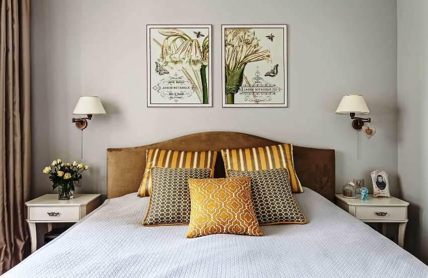 Classic styles on 12 squares are more difficult to write, but possible. In this case, the key element is the double bed, which is decorated with a wrought iron or carved headboard, as well as patterned textiles. In addition, wooden bedside tables are installed. The classic styles are complemented by beautiful curtains, paintings by Renaissance artists on the walls and antique lamps. The main areas of the classics include the following: