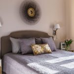 The main advantage of this arrangement of furniture is considered to be symmetry, which creates a feeling of properly organized space and comfort. The disadvantages of such an interior include the small width of the cabinet, small gaps between the main pieces of furniture, and the impossibility of installing a bedside table under the TV.
