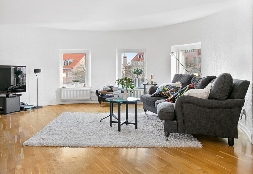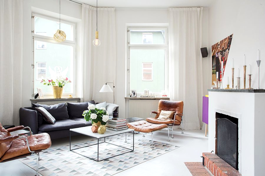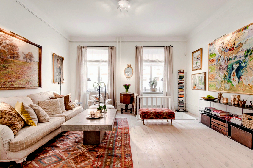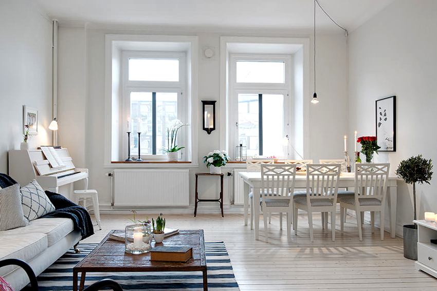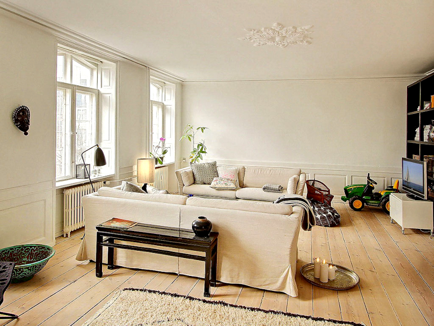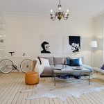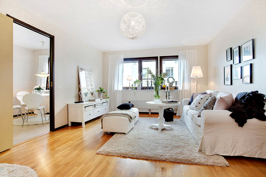 The room is finished exclusively with natural materials such as wood, stone, fur. You can use high-quality imitations, which are clearly displayed by the photos of the renovation in the living room. The Scandinavian interior is characterized by a light pastel palette of shades, in which the main place is given to the virgin white color. Bright colors are appropriate as accent elements.