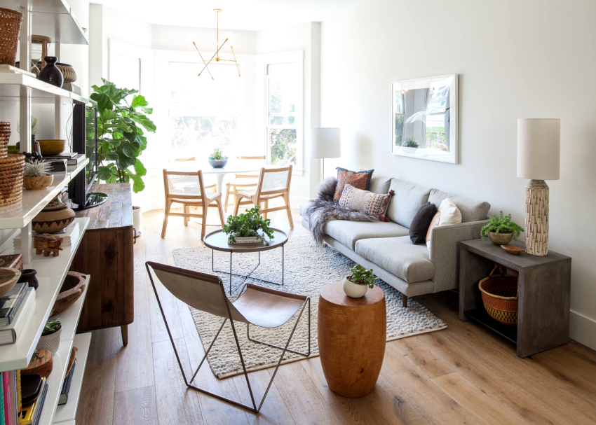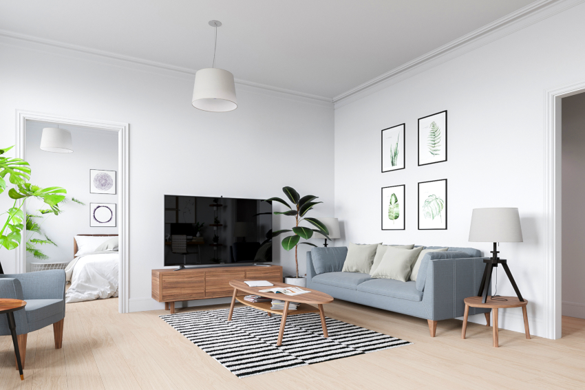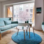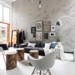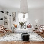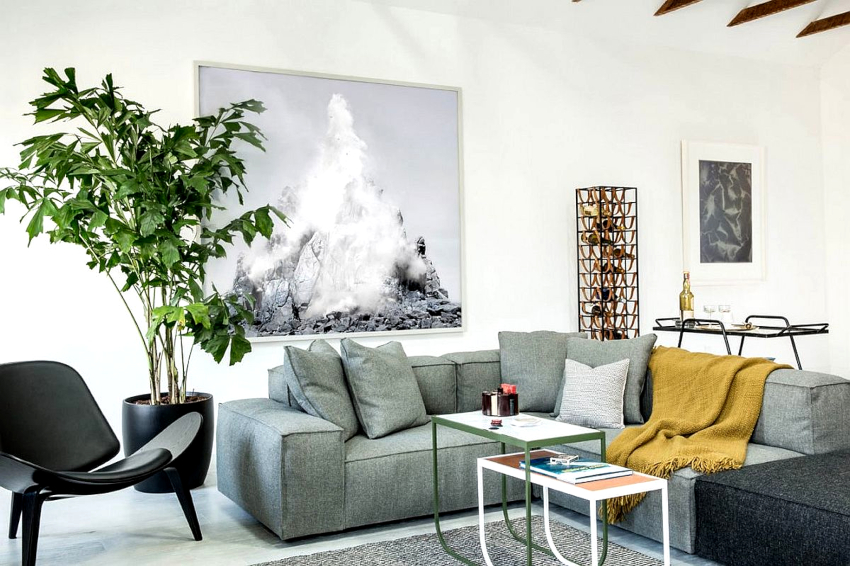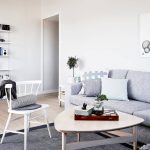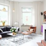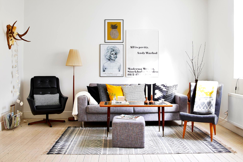Useful advice! The cool plain walls of a Scandinavian living room can be decorated with decorative decals featuring plants such as a Christmas tree or dandelion.