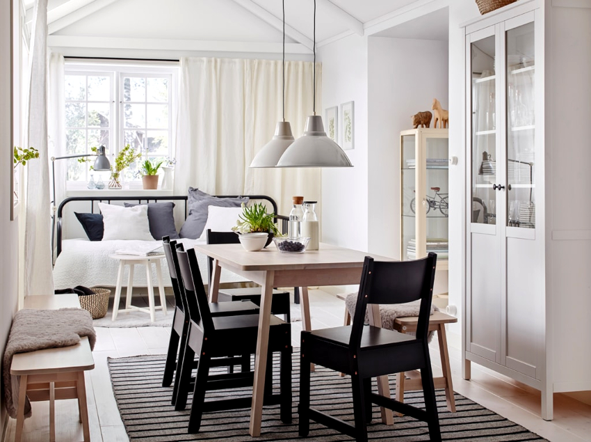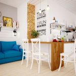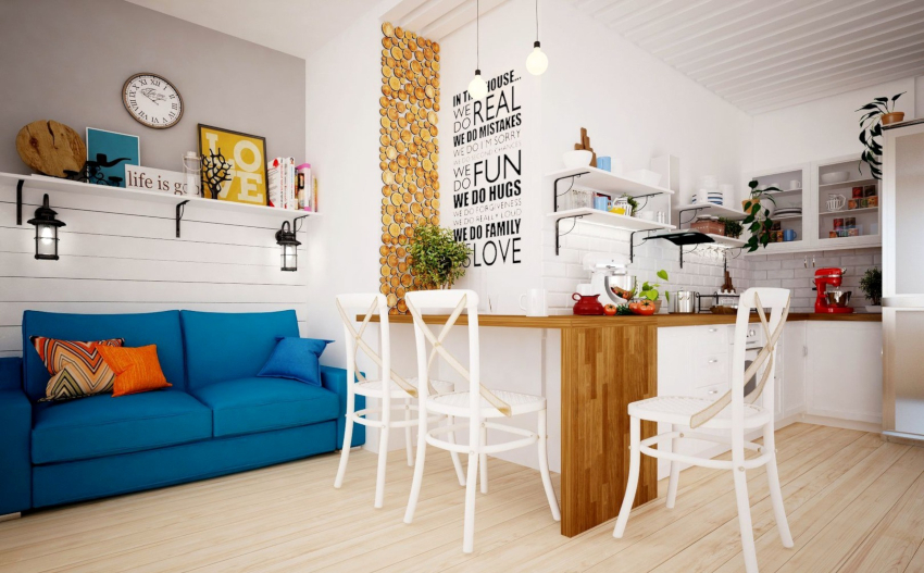 For the dining area, a table is selected in the same style as the headset. Chairs can be wooden or wicker with removable cushions. The bar counter or folding table will organically fit into the kitchen-living room in the Scandinavian style, which will delimit the kitchen space and the recreation area.