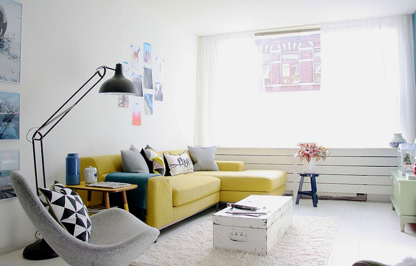 A striking contrast creates white combined with natural hues such as sunny yellows and sky blue. Green looks fresh and natural in the interior of the living room. These tones can be used for flooring, walls or furniture. Single accents can be created using shades of cobalt blue or cherry red.