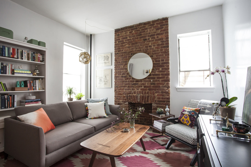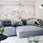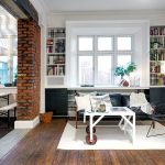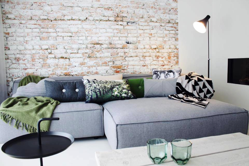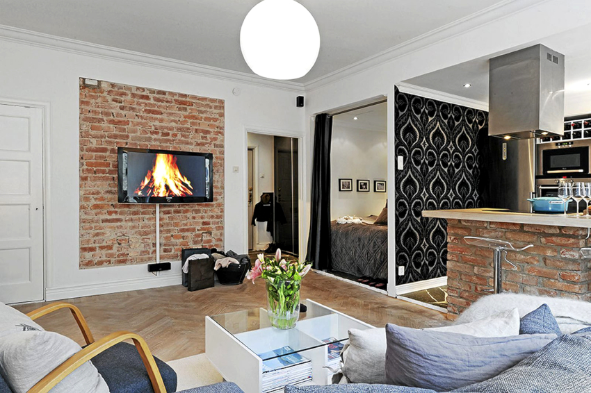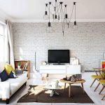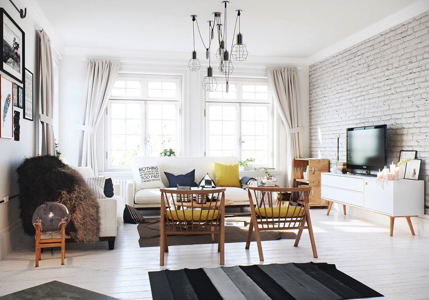 An accent wall trimmed with brick or brick-like tiles looks organically in a Scandinavian living room. It can remain in its natural red color or turn white to form a glossy or matte finish.