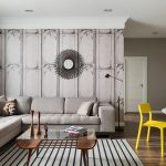 You can add warmth to a minimalist interior using light monochromatic wallpapers with a pronounced beautiful texture. One of the walls can be finished with material with flat color patterns or delicate floral motifs. A suitable solution is a wallpaper with a motif that matches the Scandinavian atmosphere. The most popular options are graphic designs, images of animals, or their outlines. In the living room with a fireplace, wall murals imitating wood or stone will look spectacular.
