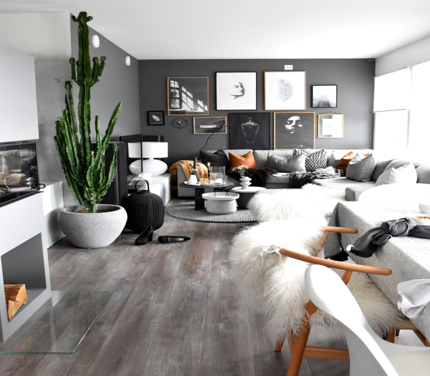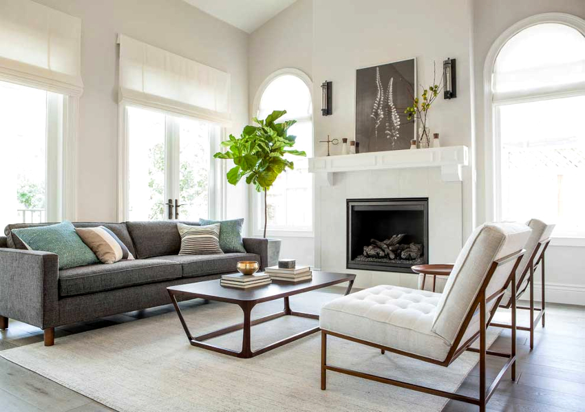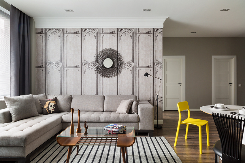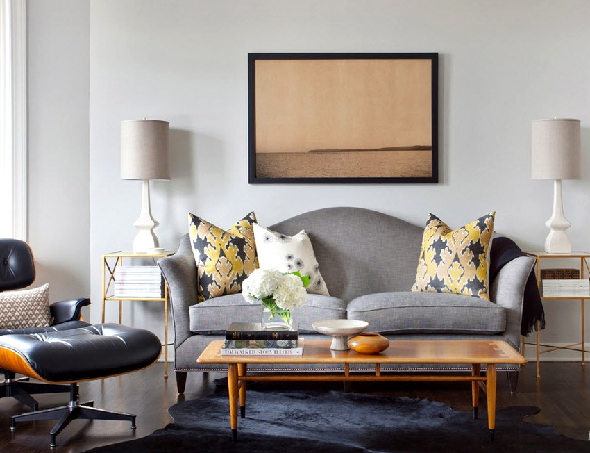 Gray looks expressive and festive in the interior of the living room. In combination with white, it will not look dull. You can revive the boring gray interior of the living room with the help of lilac, cherry, plum, pistachio or olive colors, which can be reflected in furniture upholstery, textiles or decor.
