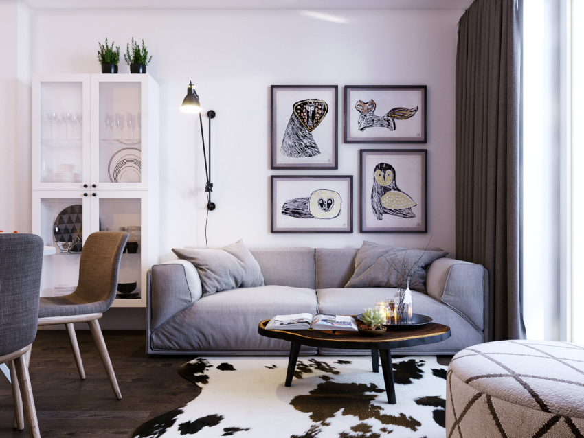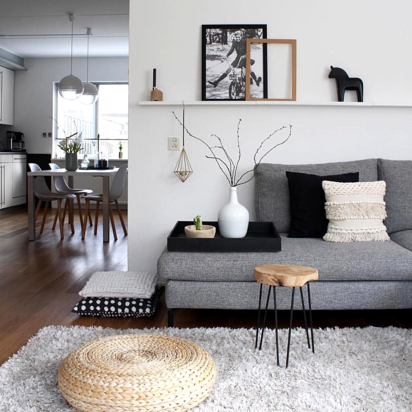 Scandinavian interiors do not tolerate excesses in furnishings. The overall concept should be simple and concise. However, it is the bright and original decor elements that give the characteristic expressiveness to the gray-white interior of the living room. Porcelain products, metal souvenirs, plaster, wood and ceramics will look organic here. Handicrafts will become the highlight of the room.The picture above the sofa looks original in the interior of the living room (the photo clearly shows this), made in a retro style or depicting mountain snow-covered landscapes. You can hang several family photos in wooden frames.