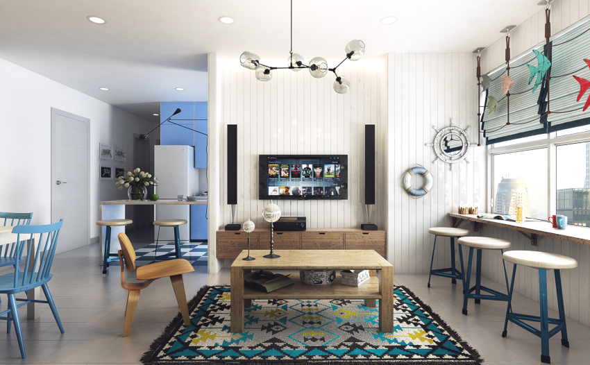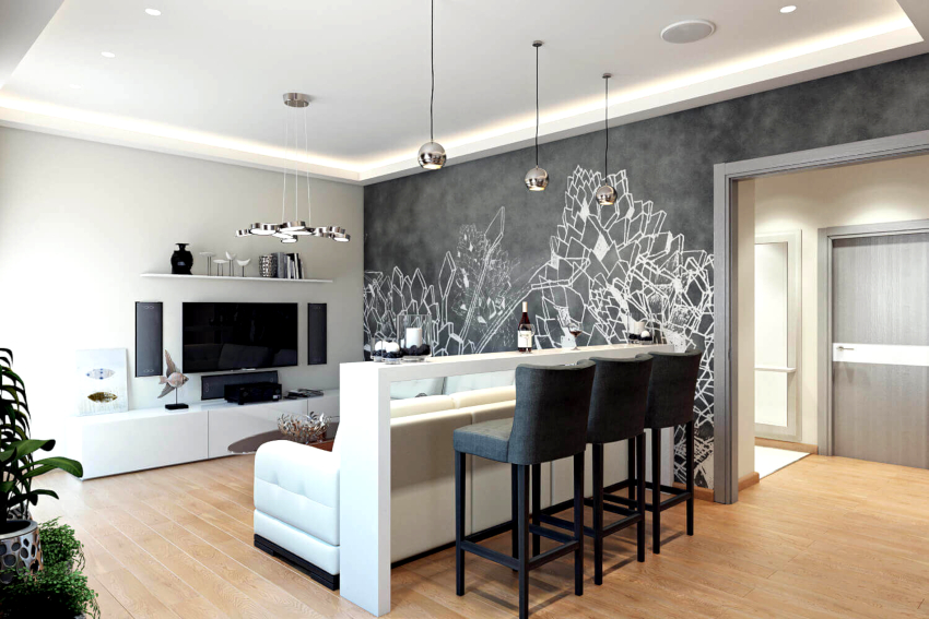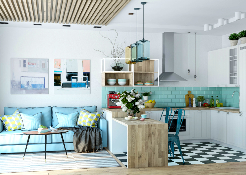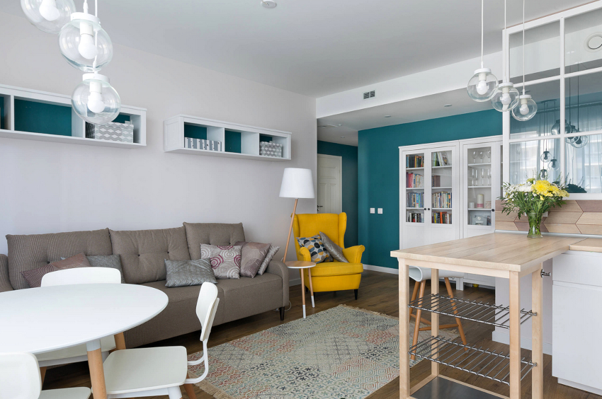 A bar counter or a transforming table will organically fit into the kitchen-living room in the Scandinavian style
