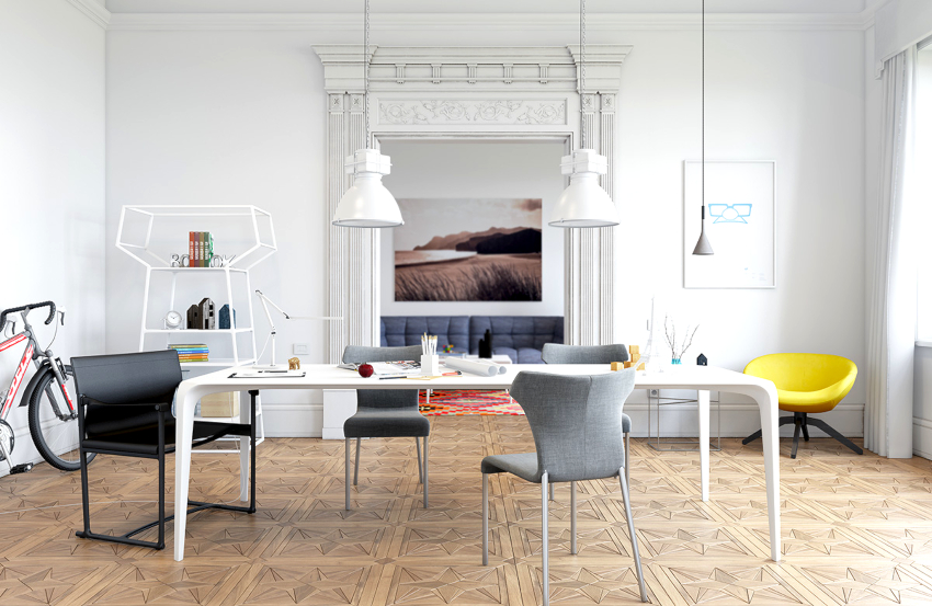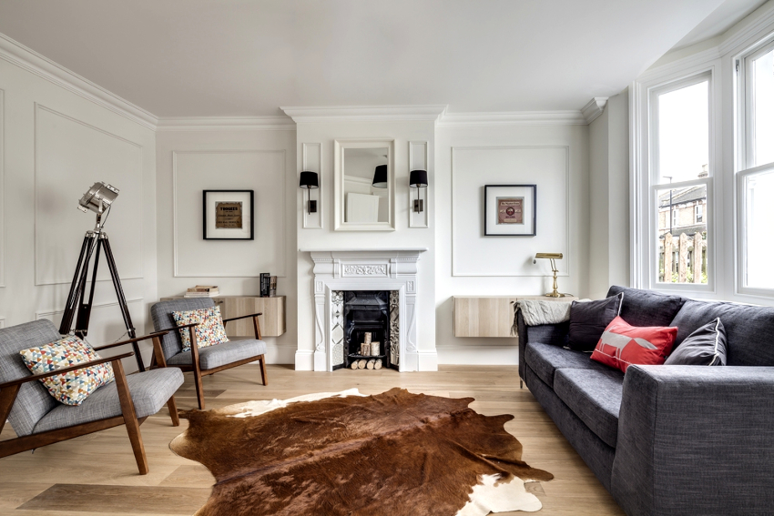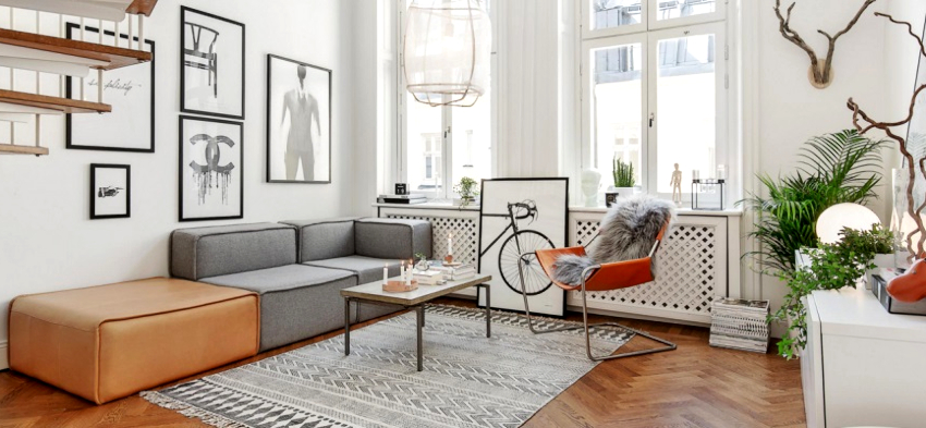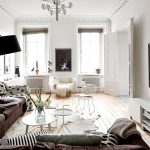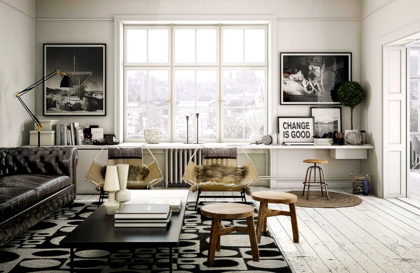 The Scandinavian style fits harmoniously into the living room design. Using light finishes, a minimum number of pieces of furniture made from natural materials and decorative elements, organizing generous lighting, it will be possible to turn the room into a light, boundless space with an exquisite setting and a pacifying atmosphere, conducive to good rest and pleasant pastime with friends.