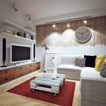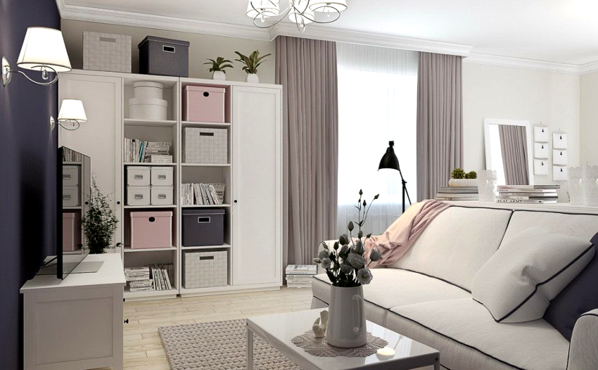 For sleeping, you can install a fold-out sofa, which transforms into a bed at night, and in the daytime is a full-fledged place for receiving guests. Another option is to create a separate sleeping area with a bed and a guest area with a sofa, armchairs and a coffee table.