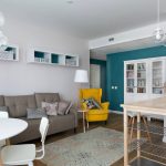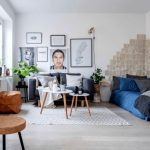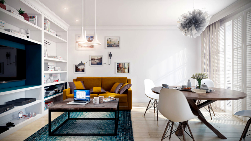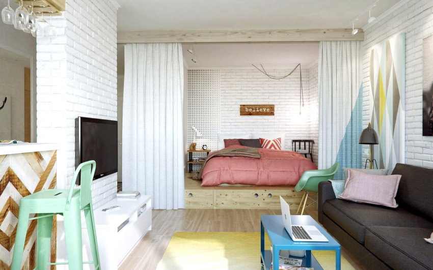 The shared bedroom-living room combines a seating area, reception area and storage space, respecting the functionality of each separate space. The bedroom-living room in the Scandinavian style is decorated in a light palette. Peach and turquoise colors will look original and calm in the interior of the living room-bedroom. Natural materials are used in the decoration. The room should have a minimum amount of furniture and decor.