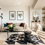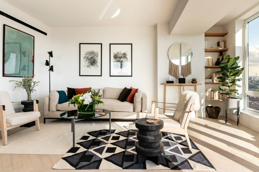 You can get a daring, but not flashy interior of a white living room with the help of black splashes. The most appropriate option would be austere photo frames, lighting frames, or an open bookcase in this color.